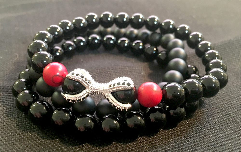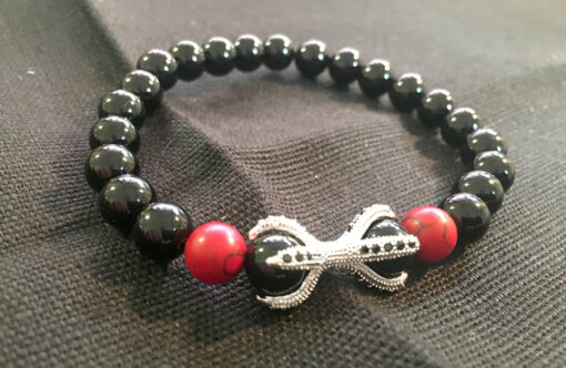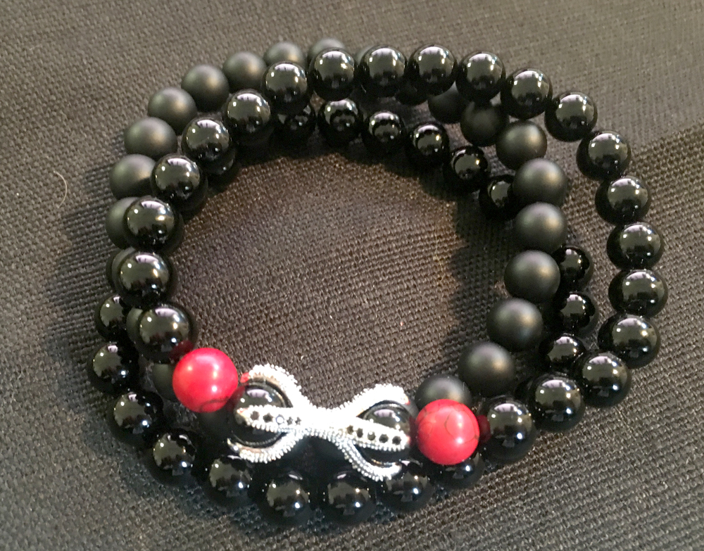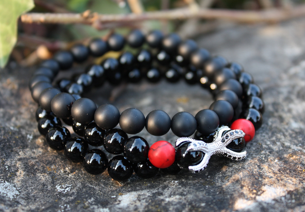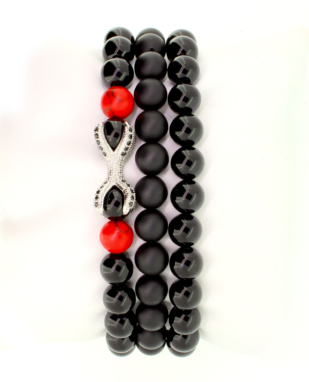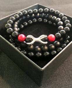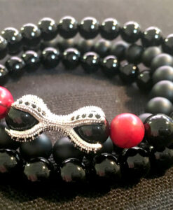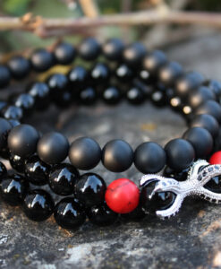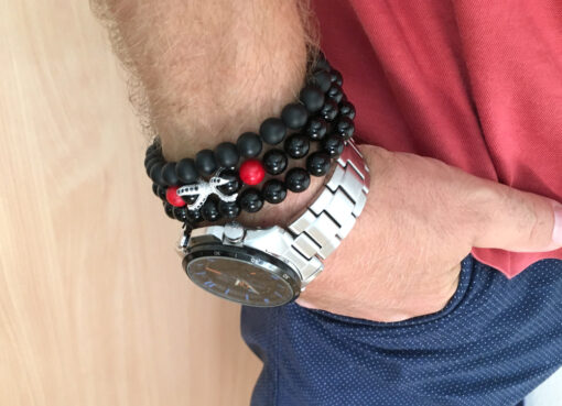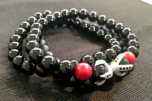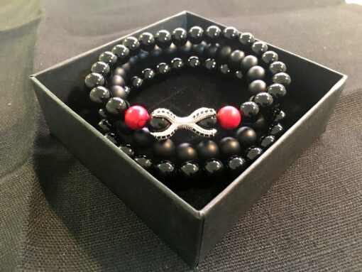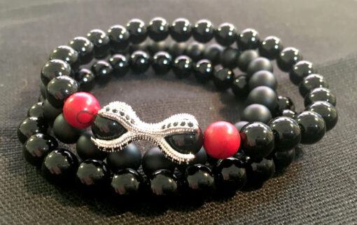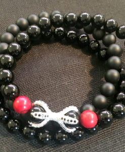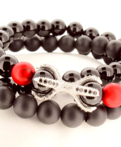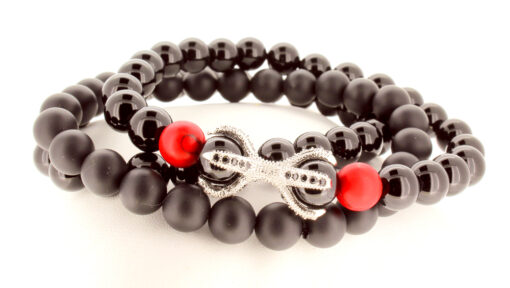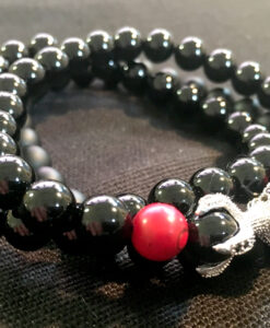 • 1Perlenarmband besteht aus schwarzen Achat-Perlen glänzend mit 2 roten Perlen und einer silbernen Spange.