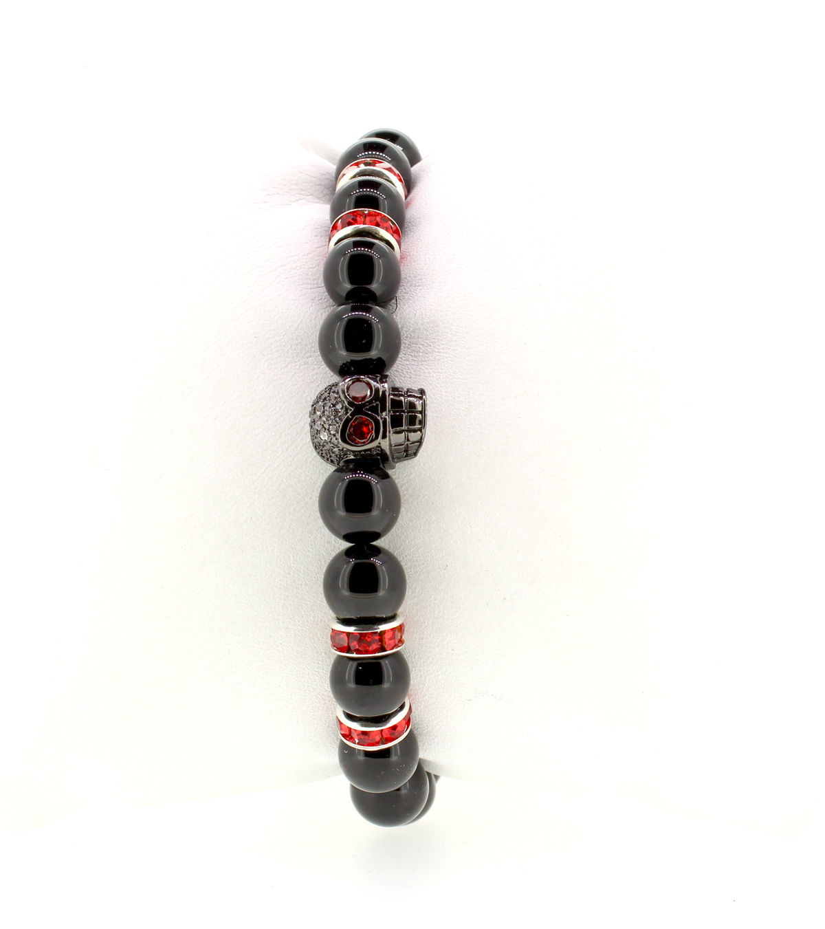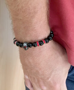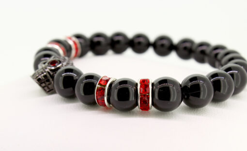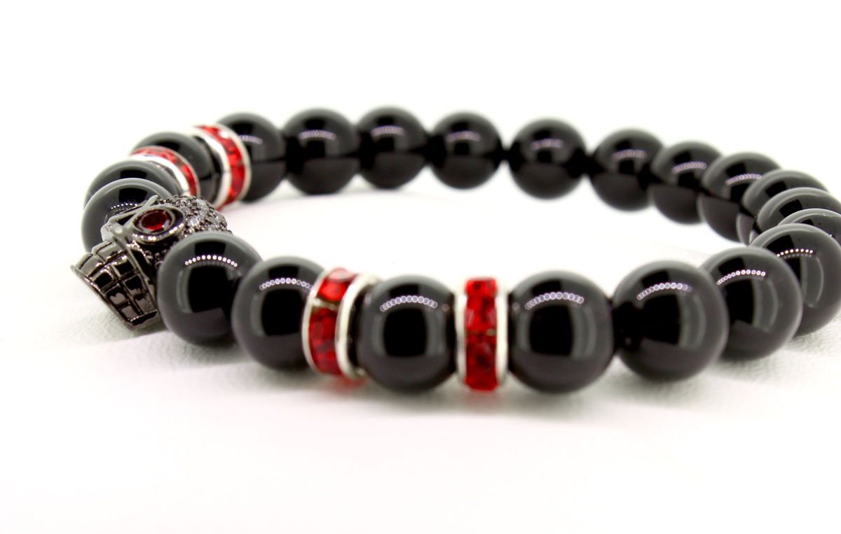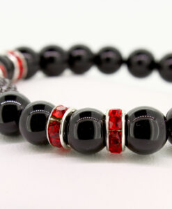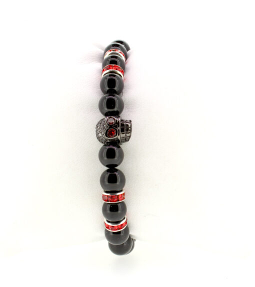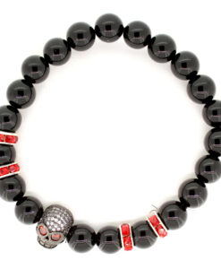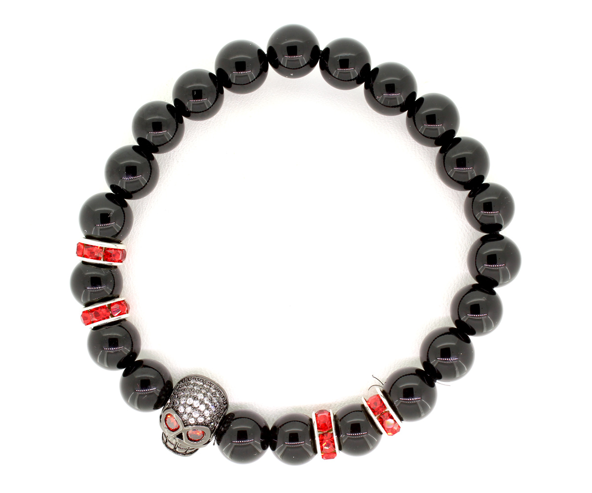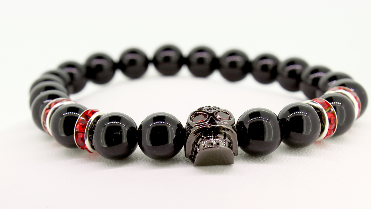 ELROY – Dieses Perlenarmband aus schwarzen Onyx rockt. Die roten Strass-Spacer mit dem schwarzen Totenkopf unterstreichen die Coolness dieses Armbandes. Das Perlenarmband besteht aus 8mm Perlen.
