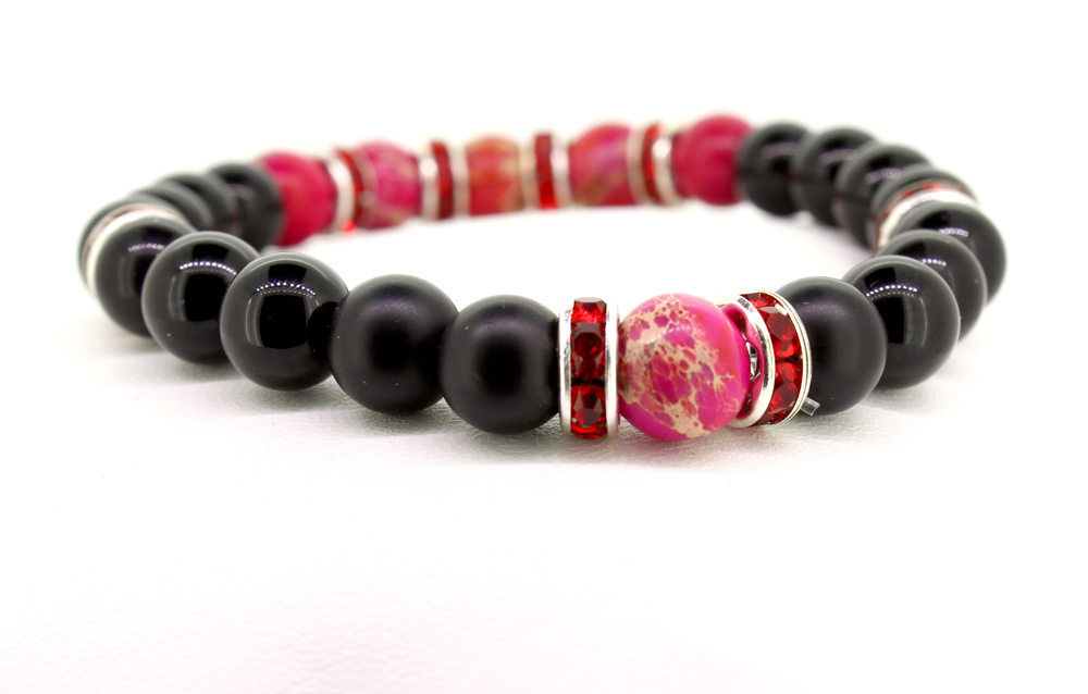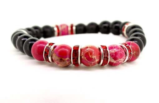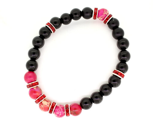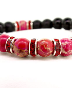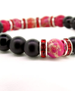 JAMELIA – Fuchsia-Hamätit-Perlen trifft schwarzen Onyx mit rötlichen Spacern. Mit 8mm Perlen gefertigt. Läßt sich variantenreich mit vielen Angeboten von LoBo-Bracelet-Armbändern kombinieren. Hol Dir deinen Style…